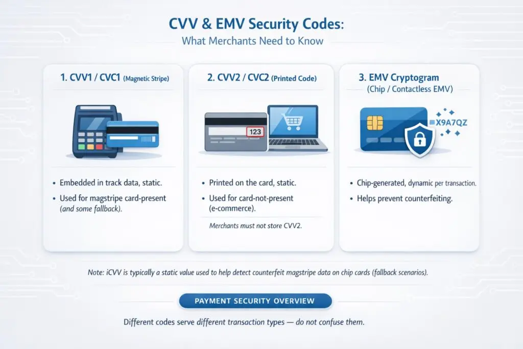 3. EMV Dynamic Cryptogram (Chip/Contactless Code): When you use a chip card (insertion) or NFC (tap-to-pay), the chip inside the card performs a complex cryptographic calculation with the POS terminal to generate a one-time, dynamic transaction cryptogram. This cryptogram is far more secure than the static CVV2 because it is different for every transaction.