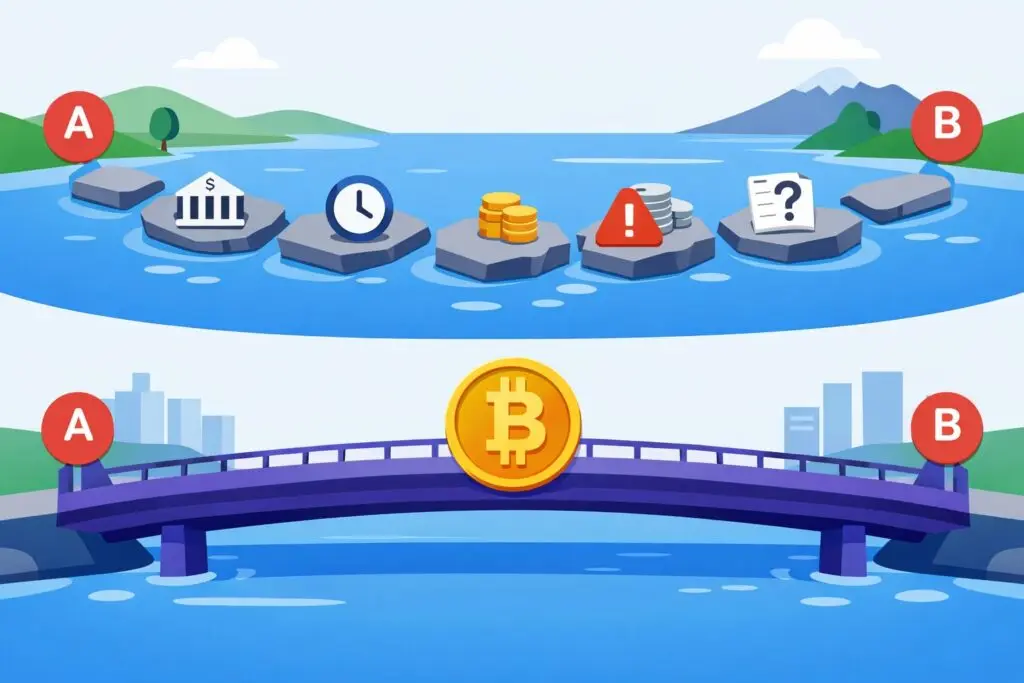The traditional payment system is like a long chain made of many fragile links. Cryptocurrency payments (especially stablecoins) offer a fundamentally new solution: they don’t just optimize this chain; they replace it entirely with a shorter, stronger “digital contract.”